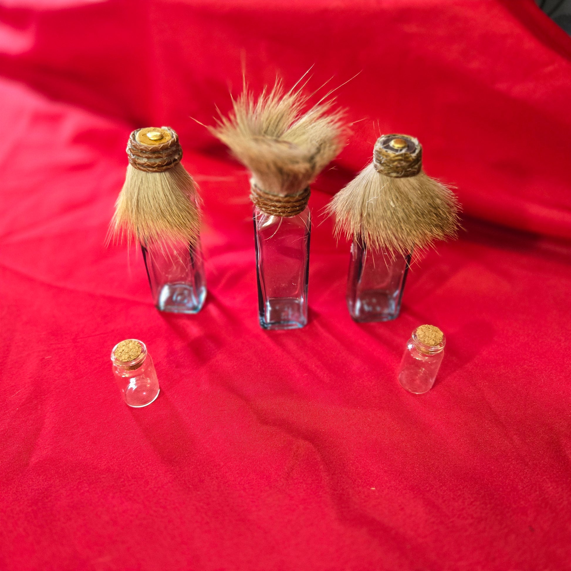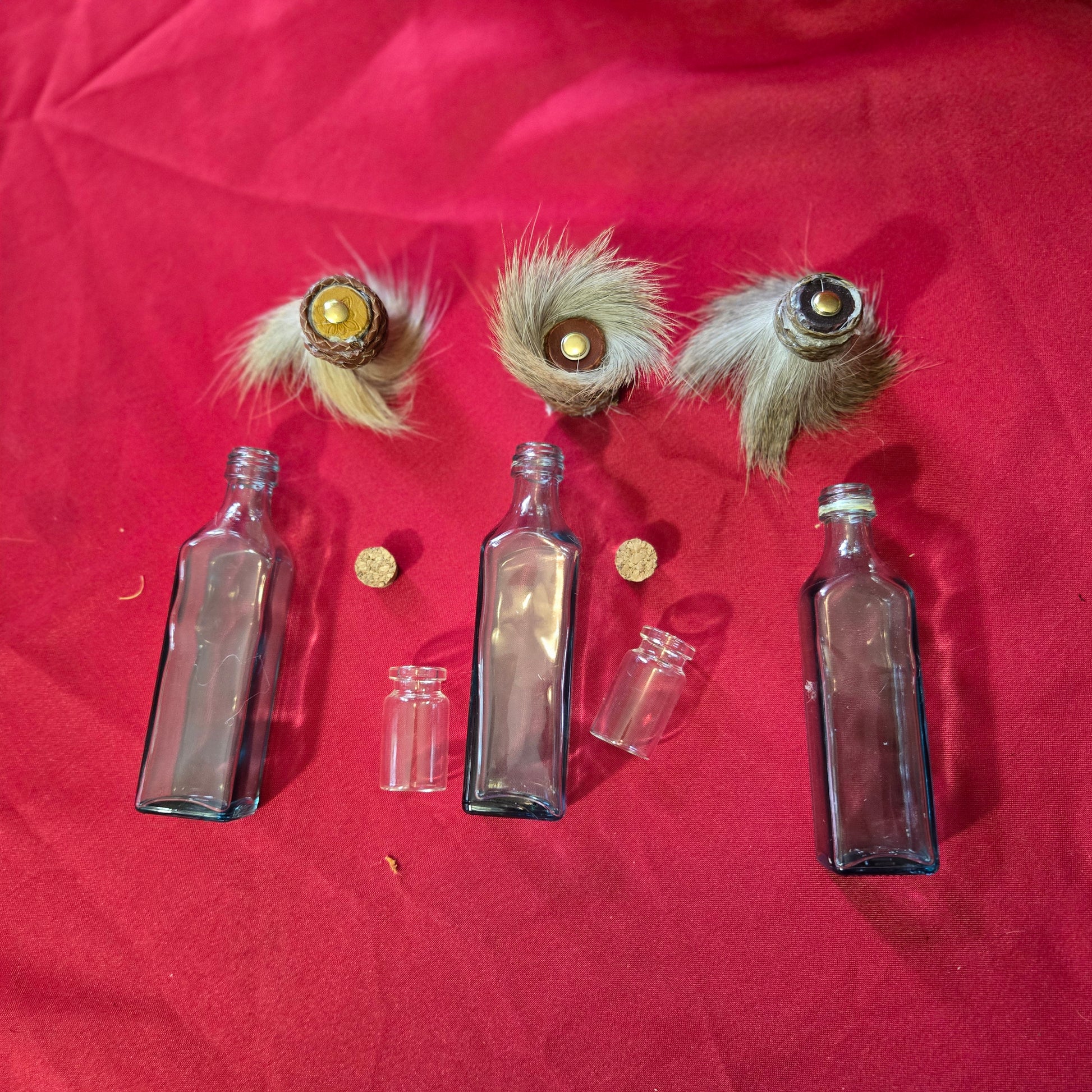 Three crystal-blue vials with natural fur caps — ideal for elemental brews, chilly elixirs, or potions that just like to feel fancy.